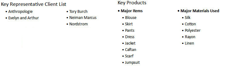 We have a dedicated Sales & Marketing team to explore global opportunities. Our president of the US office and oversees all the sales & marketing activities. We have showroom facilities in our NY and HK offices. Our global footprints allow us provide fast turnaround time for customers' requests. We are currently working with the following customers and committed to build long-term relationships with our partners: Nordstrom, Neiman Marcus, Tory Burch, Anthropologie, Evelyn and Arthur etc. |